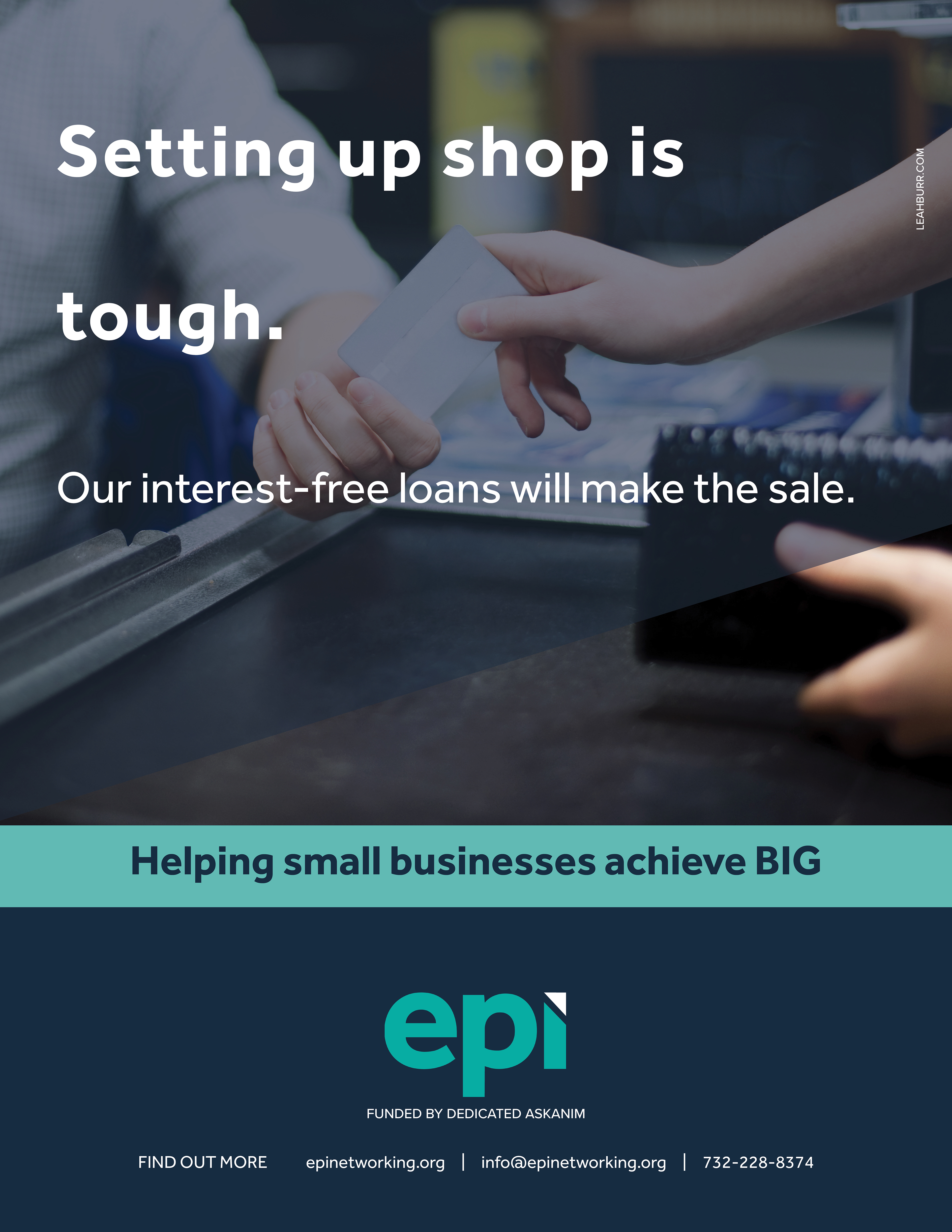 EPI is a non-profit organization that helps small businesses. This ad series is specifically about their interest free loans. We kept it professional and businesslike, but added a warm "We are here to help!"